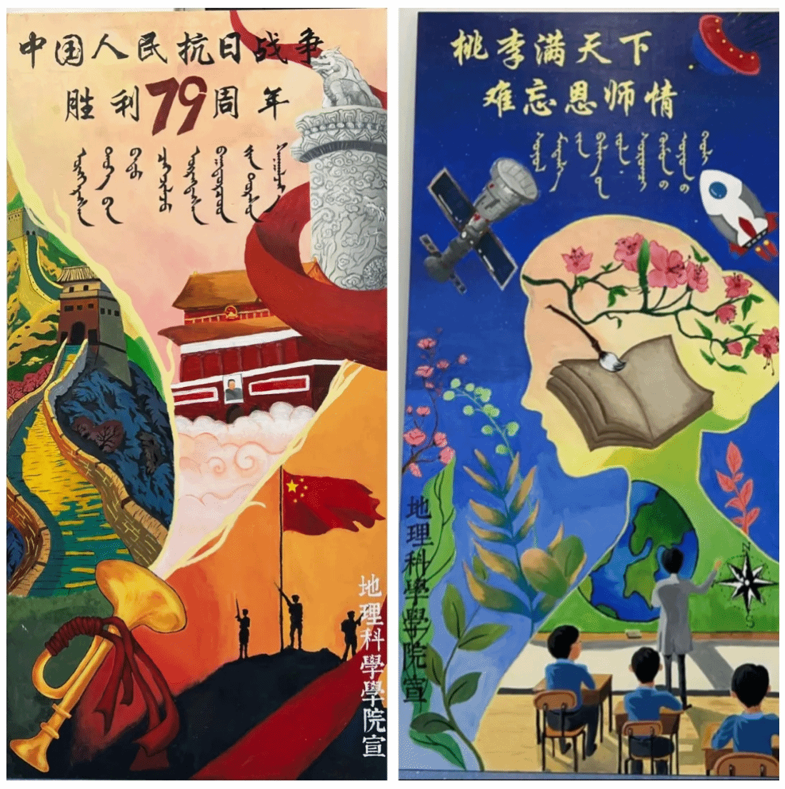 军训期间,公司军事技能训练板报小组用画笔书写公司的风采,完成了“中国人民抗日战争胜利79周年”与“桃李满天下,难忘恩师情”俩幅作品,以表达抗日战争胜利的民族自豪感和对教师的敬佩之情。
